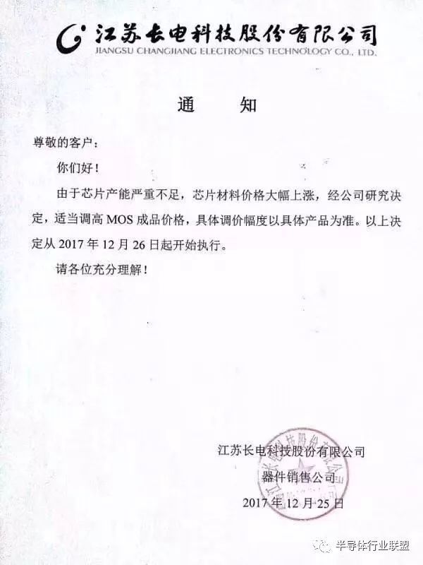 12月25日,江蘇長電科技股份有限公司向其可客戶發(fā)布漲價(jià)通知,通知稱由于芯片產(chǎn)能嚴(yán)重不足,芯片材料價(jià)格大幅上漲,經(jīng)公司研究決定,適當(dāng)調(diào)高M(jìn)OS成品價(jià)格,具體調(diào)價(jià)幅度以具體產(chǎn)品為準(zhǔn)。以上決定從2017年12月26日起開始執(zhí)行。