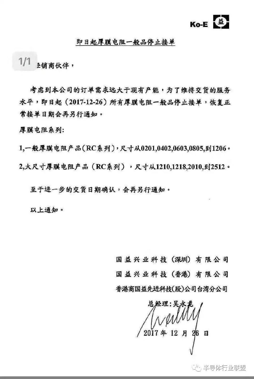 2017年7月10日,大毅發(fā)布通知,表示即日起暫停0603-1206芯片電阻產(chǎn)品的接單,待檢討售價(jià)后才恢復(fù)接單。