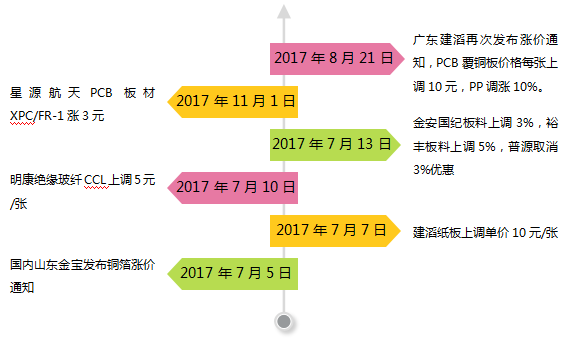 PCB的基材主要是覆銅板CCL,CCL占PCB材料成本約40%左右,而CCL當(dāng)中,銅箔占CCL成本30%(厚板)/50%(薄板)、玻纖布占40%(厚板)/25%(薄板)、環(huán)氧樹脂15%左右。去年8月起,CCL上游銅箔受鋰電銅箔供需緊張的影響開始漲價(jià),玻纖布也自2016年四季度開始漲價(jià)。