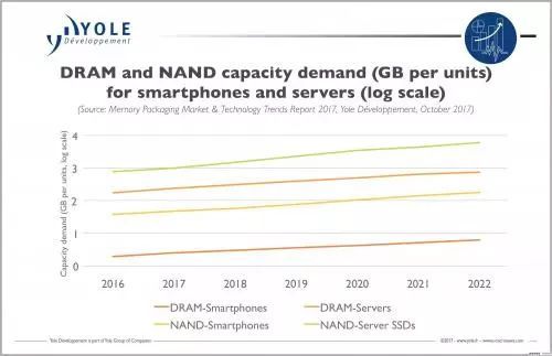 存儲(chǔ)器的需求來自各行各業(yè),特別是移動(dòng)和計(jì)算(主要是服務(wù)器)市場。平均而言,每部智能手機(jī)的DRAM內(nèi)存容量將增長三倍以上,預(yù)計(jì)到2022年將到6GB左右,而每部智能手機(jī)的NAND存儲(chǔ)器容量將增加5倍以上,預(yù)計(jì)到2022年將達(dá)到150GB以上。對于服務(wù)器來說,預(yù)計(jì)到2022年DRAM存儲(chǔ)器容量將達(dá)到0.5TB以上,企業(yè)級市場SSD的NAND存儲(chǔ)器容量將高達(dá)5TB以上。這些市場的增長驅(qū)動(dòng)力來自深度學(xué)習(xí)、數(shù)據(jù)中心、網(wǎng)絡(luò)、AR/VR和自動(dòng)駕駛。