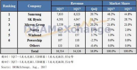 圖|2017第一/二季度全球DRAM廠自有品牌內(nèi)存營收排行
