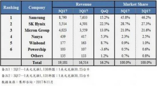 圖|2017第三季度全球DRAM廠自有品牌內(nèi)存營收排行
