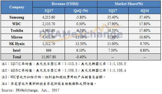 圖|2017第三季度全球NAND廠自有品牌內(nèi)存營收排行